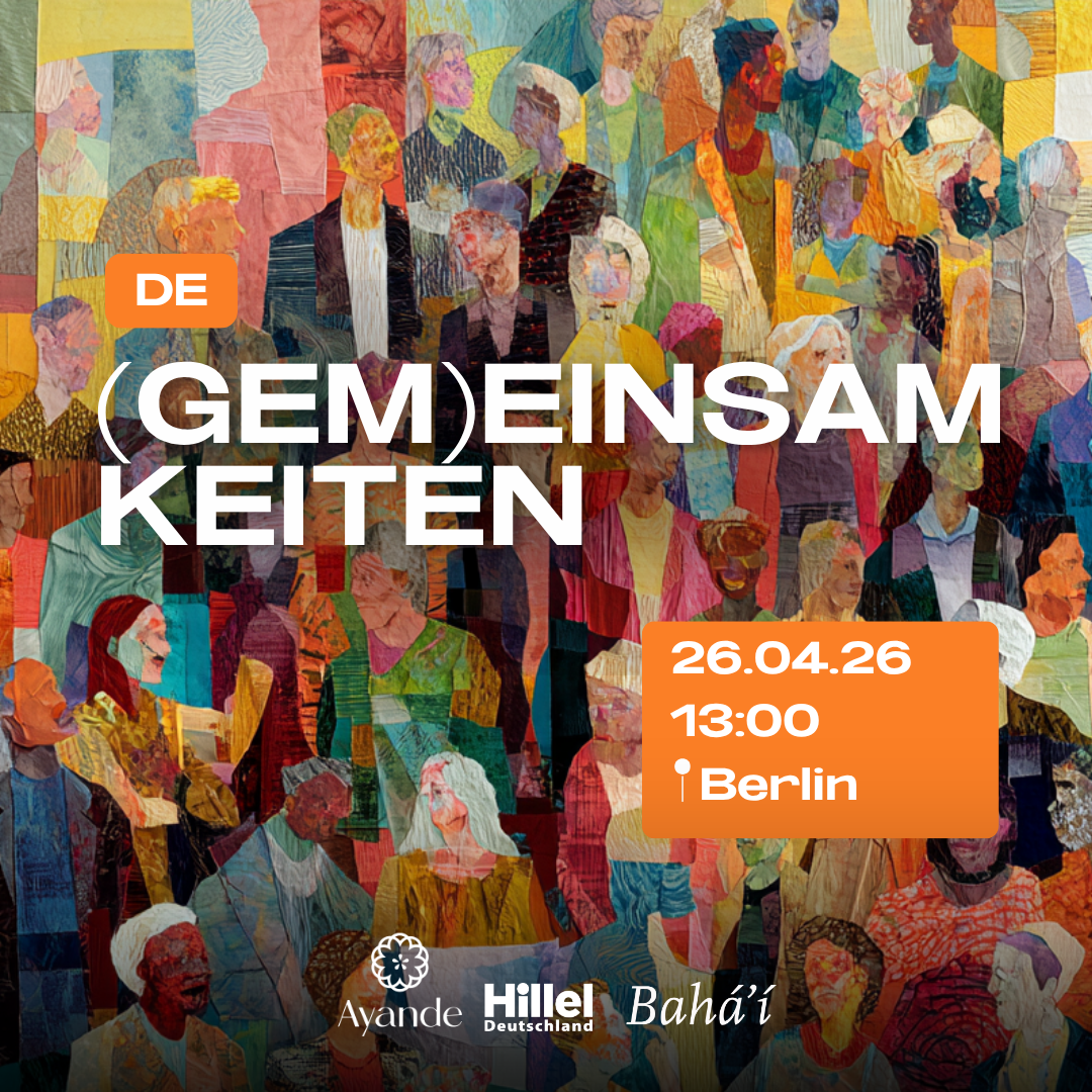 The event “(Ge)meinsamkeit” invites you to join other young people in a conversation about belonging, loneliness, and social engagement, and to discover new perspectives. Together with Ayande, the Bahá’í Community in Germany (K.d.ö.R.), and Hillel Germany, we are creating an open space to share experiences and develop strategies for coping with loneliness. Join us on April 26 from 1:00 p.m. to 5:00 p.m. at Hillel Berlin Space and register now—we look forward to seeing you!